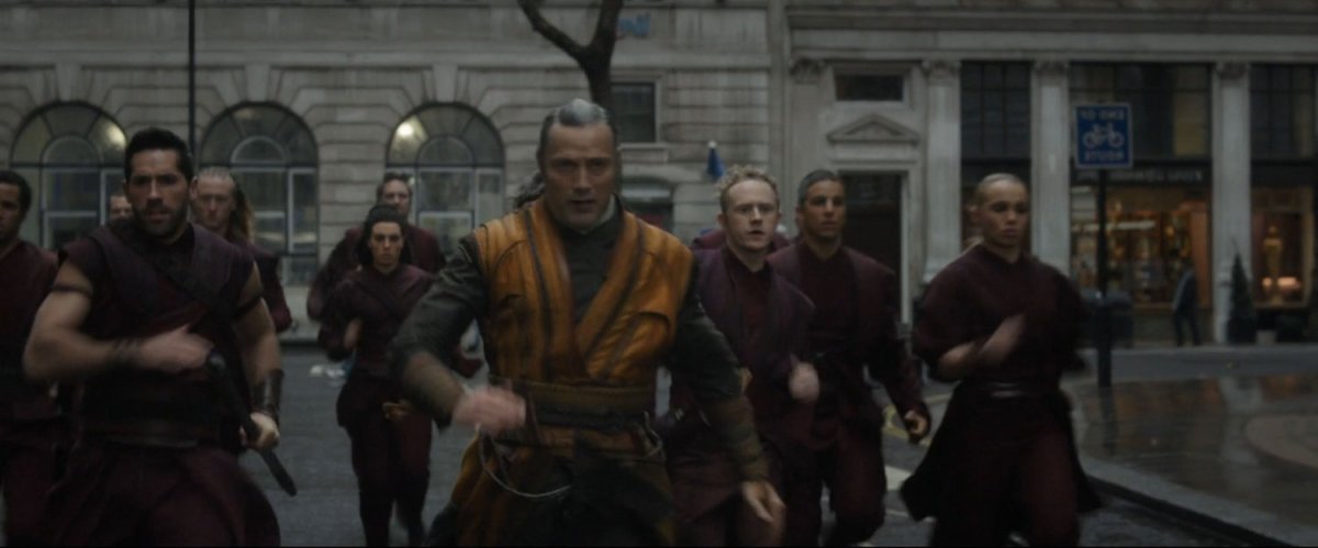 They are chased by the Ancient One who confronts Kaecilius and his acolytes on Great Scotland Yard near Northumberland Ave.