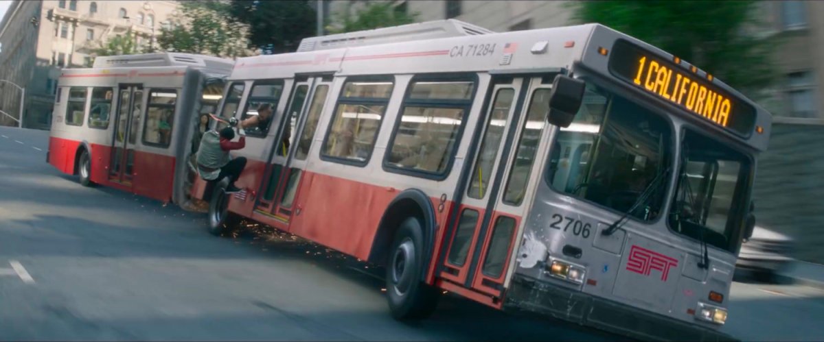 In a long take, Shaun runs across the roof and slides off the front of the bus in front of 1010 Bush St, to hang on the mirror rod.