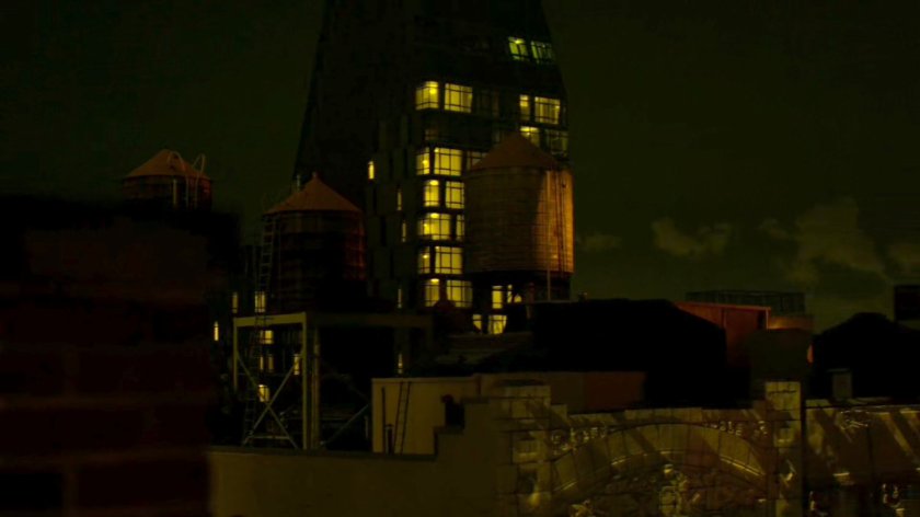 The assumption for this location is that the building Matt surveils the city from at the opening of Season 2 (when he hears the sounds of the jewelry theft) is supposed to be the same location where he fights Frank Castle at the end of the episode. The distinctiveness of the rooftop is too unique to be anything else. The production filmed atop a rooftop at the corner of 5th Avenue and W. 17th Street, which looks a little different in recent satellite imagery. An image from circa 2015 is presented below to show how it looked at the time.