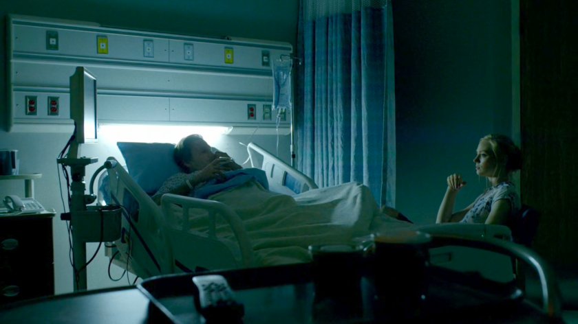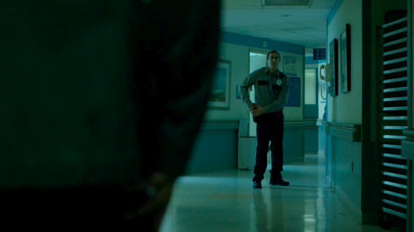 Ben speaks with Shirley at a nurse’s station, walks through a dark hallway, and visits Doris in a patient room.