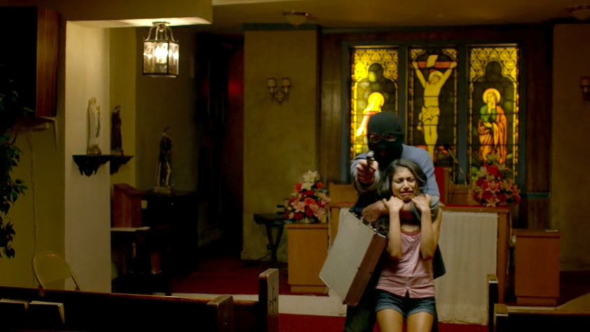 The final diamond thief grabs a female hostage from a stoop before running into a church to evade the police. Too bad Daredevil gets to him first.