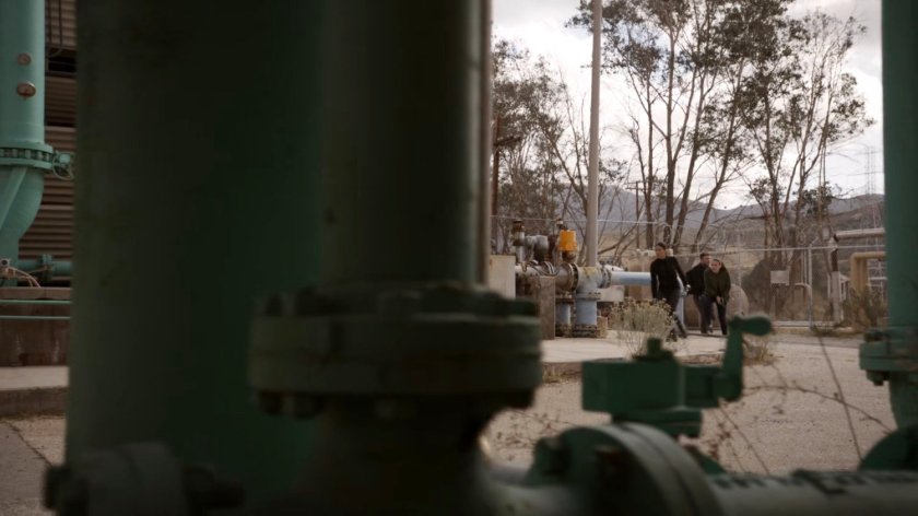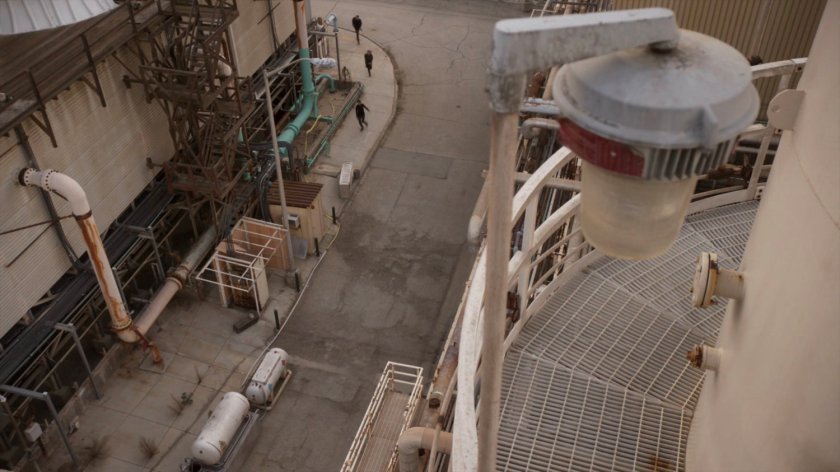The production returned to the Kimberlina Power Plant on Placerita Canyon Road in Santa Clarita for the exteriors of this sequence. This location served as a particle accelerator complex in Utah in Season 1, and was both a Roxxon facility and the Manfredi Waste Management plant in Agent Carter. The two towers in the final image, which Yo-Yo is looking at, have been digitally added.
